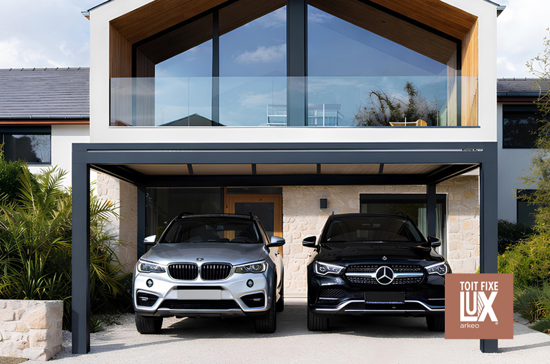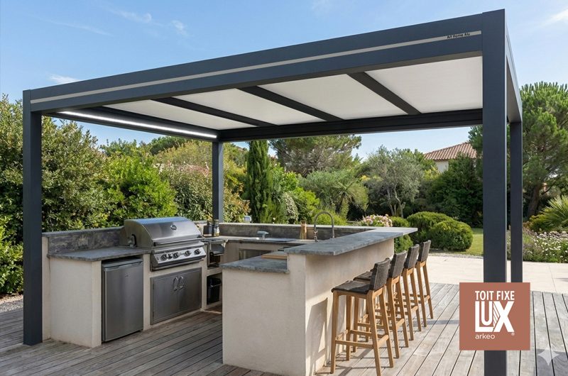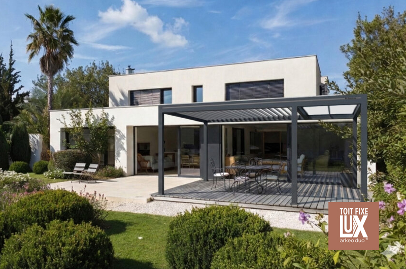 Et aussi : LUX ARKÉO DUO, un aménagement extérieur hybride combinant toit fixe et pergola bioclimatique. Il transforme la terrasse en un véritable espace de vie, offrant une zone protégée en permanence pour installer cuisine d’été ou coin détente, tout en permettant de moduler lumière et ventilation selon les saisons. Élégant et fonctionnel, il prolonge la maison vers l’extérieur pour un usage confortable toute l’année.